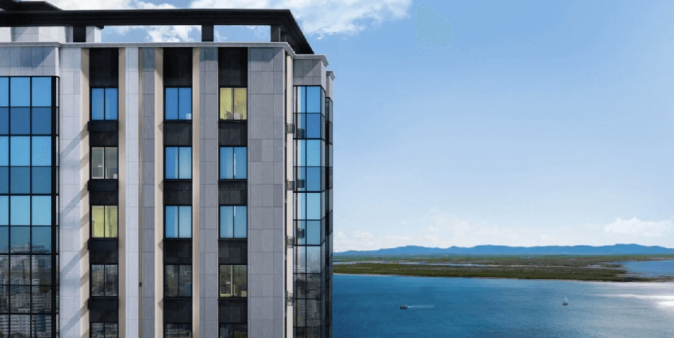 Из окон квартир открывается потрясающий вид на Амур, на город и ТЦ BROSKO MALL, который выглядит футуристично и динамично даже зимой, когда рано темнеет.